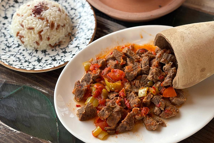 Dana et, soğan, domates, biber, sarımsak ve pilav